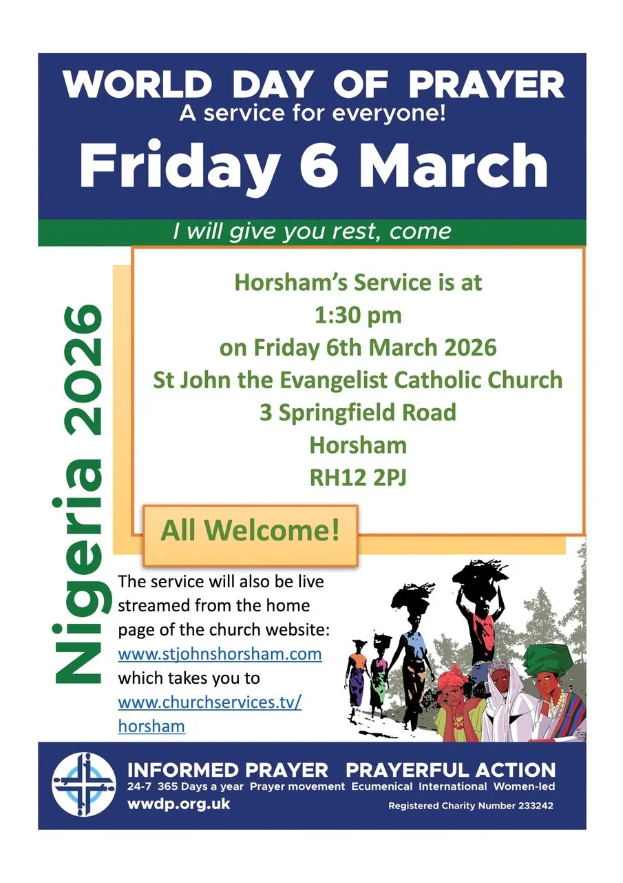Mar 6 World Day of Prayer - Nigeria Friday 6 March 2026 13:30 14:30 St John the Evangelist Catholic Church (map) Google Calendar ICS View Event →